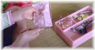 なにやら、手のひらサイズの人形の座布団を作ってる模様。
