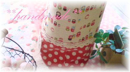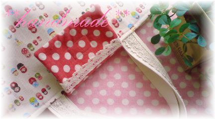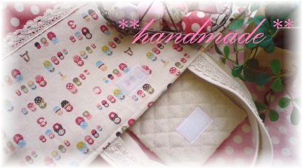 マトリョーシカちゃんの生地とレッドのドットを組み合わせ。